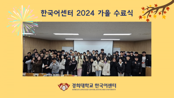 2024학년도 가을학기 수료식(2024.11.29) 등록일s 25-03-06 15:20 작성자 KLC 조회수 329 2024학년도 가을학기 수료식(2024.11.29) 이전글2024학년도 겨울학기 수료식(2025.02.26) 다음글2024학년도 가을학기 문화체험(2024.11.01) 목록