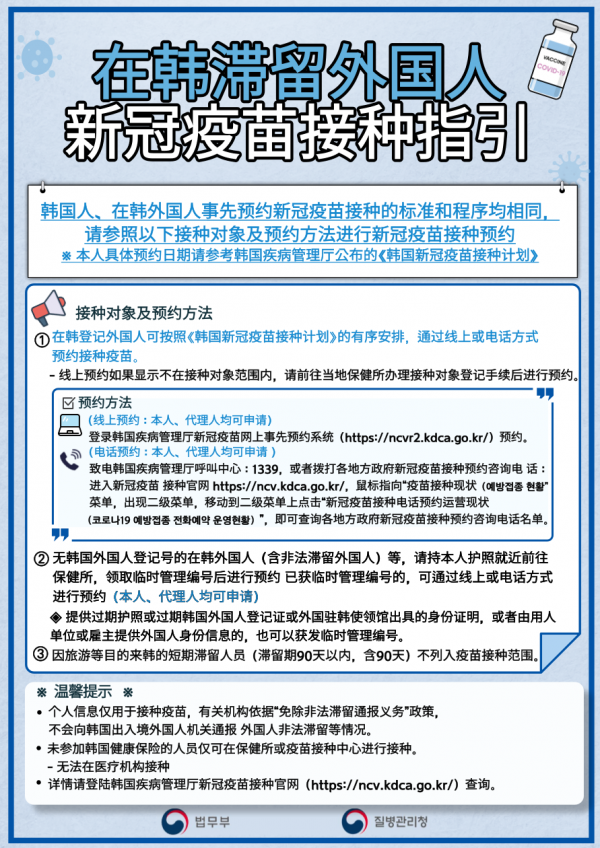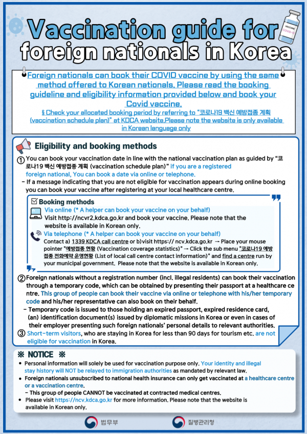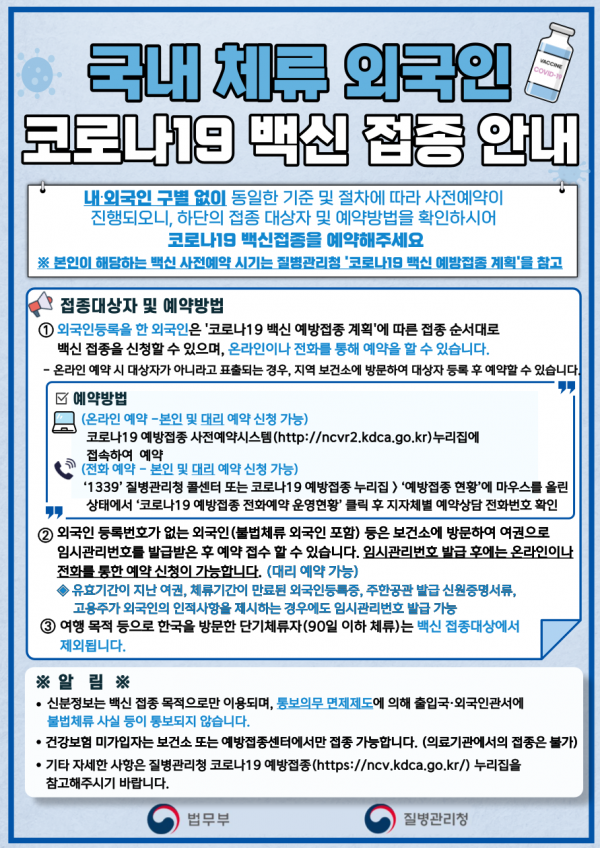 국내 체류 외국인 코로나19 백신 접종 안내문(Vaccination guide for foreign nationals in Korea) 등록일 21-09-14 09:37 작성자 KLC 조회수 3,127 0903 국내 체류 외국인 코로나19 백신접종 안내_한국어.pdf (다운로드횟수:1670) 0902_국내 체류 외국인 코로나19 백신접종 안내_Japanese.pdf (다운로드횟수:1644) 이전글보이스 피싱 경고 안내문(Voice phishing warning notice) 다음글 가을학기 개강을 축하합니다!!! 목록
