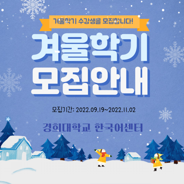 안녕하세요, 경희대학교 한국어센터입니다. 2022학년도 겨울학기 한국어 정규과정 (10주) 모집을 시작합니다.
