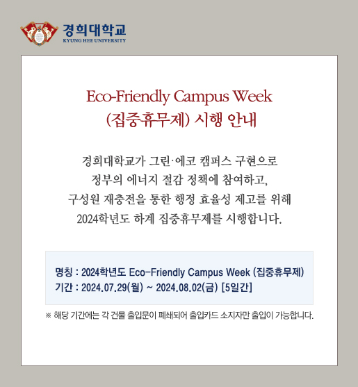 집중휴무제(Eco-Friendly Campus Week): 2024.7.29(월) ~ 2024.8.2(금)