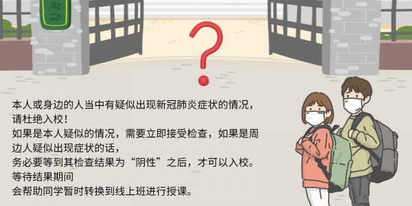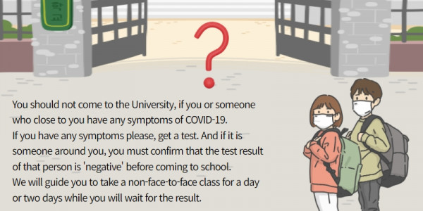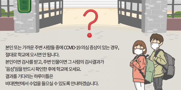 본인 또는 가까운 주변 사람들 중에 COVID-19 의심 증상이 있는 경우... 등록일 21-10-12 09:17 작성자 KLC 조회수 3,298 우리 한국어센터는 일반적인 기준 이상으로 엄격히 방역에 힘쓰고 있습니다.다양한 상황들에 대응하기 위한 매뉴얼도 마련되어 있습니다. 학생 여러분도 수칙들을 잘 따라주시기 바랍니다. 모두가 규칙들을 잘 따르면 우리는 최대한 안전한 환경에서 수업을 지속할 수 있습니다.- 한국어센터 행정실 - 이전글모바일 사진 콘테스트를 10월25일(월)에 시작합니다! 다음글 강의실 수업 규칙 10가지 목록