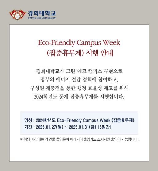 집중휴무제(Eco-Friendly Campus Week): 2025.1.27(월) ~ 2025.1.31(금)