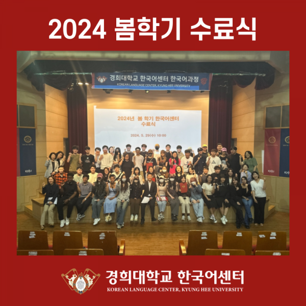 2024학년도 봄학기 수료식(2024.05.29) 등록일 24-05-30 12:57 작성자 KLC 조회수 233 2024년 5월 29일 한국어센터 봄학기 수료식이 거행되었습니다.한국어센터에서의 학업을 마치는 친구들도 있고 계속 학업을 이어나가는 친구들도 있습니다.사진에서처럼 모두 화이팅해서 새로운 시작이 되길 바랍니다. 이전글2024학년도 여름학기 문화체험(2024.07.19) 다음글 2024학년도 봄학기 문화체험(2024.04.26) 목록