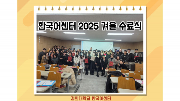 2025학년도 겨울학기 수료식(2026.02.11) 등록일 26-03-12 11:53 작성자 KLC 조회수 13 2026년 2월 11일 한국어센터 겨울학기 수료식이 진행되었습니다.한국어센터에서의 학업을 마치는 학생들과 계속 학업을 이어나가는 학생들 모두의 앞날을 응원합니다♥ 다음글 2025학년도 겨울학기 문화체험(2026.01.09) 목록