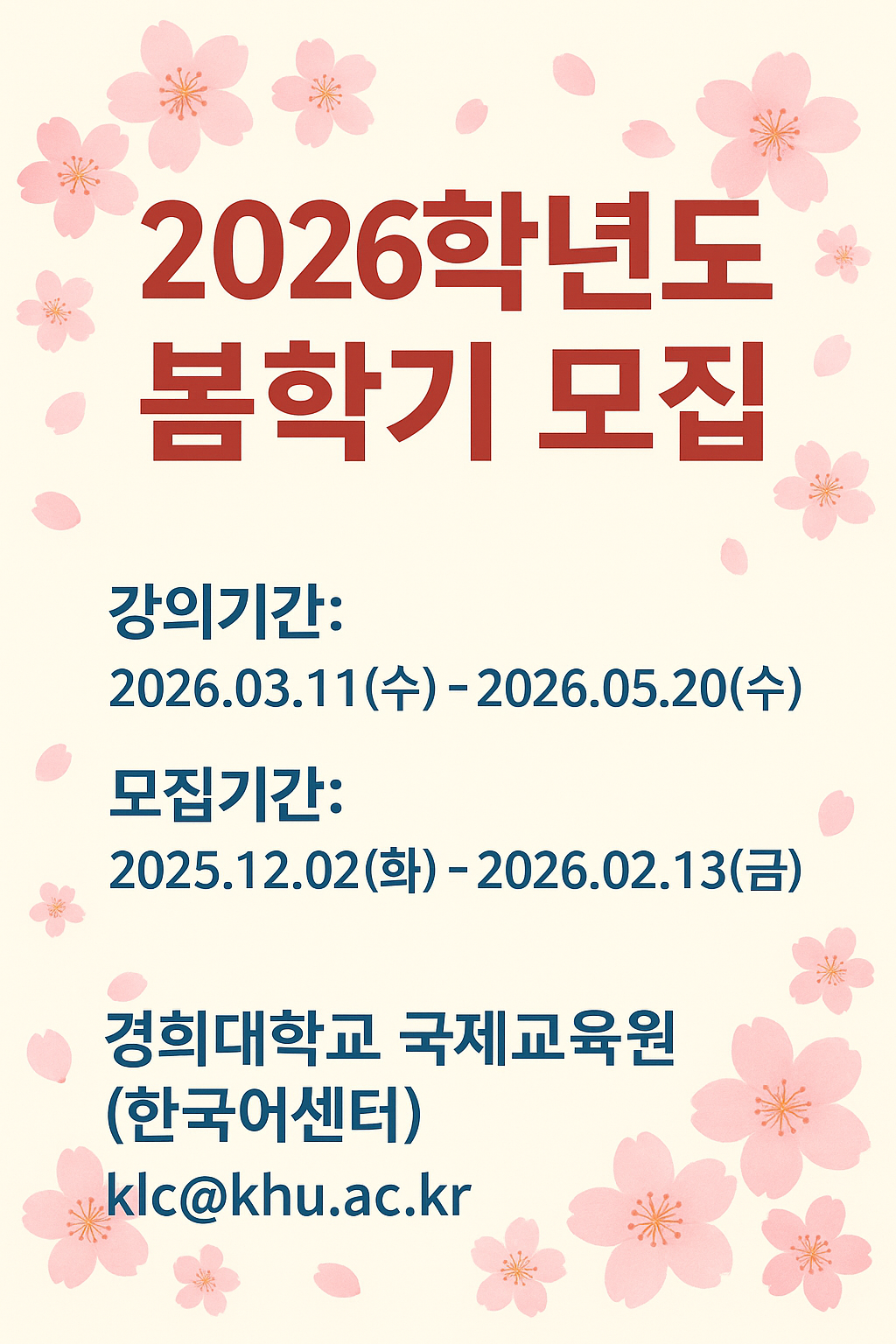 2026 봄학기 한국어 정규과정 (10주) 모집을 시작합니다.